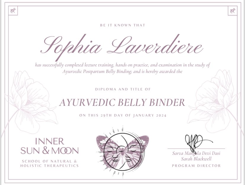 Offered by Inner Sun and Moon, an Ayurvedic Doula School. This course entailed knowledge on why it is beneficial to belly wrap Postpartum and beyond. Specific womb massages were also taught infusing botanical wisdom with Ayurvedic knowledge for post-birth recovery.